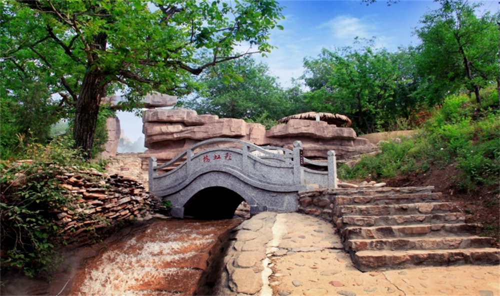 谷內(nèi)兩側(cè)彩坡石壁,中間溪流泉涌,跌水 成瀑,站在彩虹谷的西側(cè)仰望,只見全谷 蔥蔥郁郁,秀色摩霄。兩邊的怪石嵯峨, 溪泉的北坡古木秀整,草色蔥茂,百花爭(zhēng) 艷,風(fēng)景勝佳。南坡除了樹木較茂外,而 且石頭傾斜豎立。叢叢石巖很像書冊(cè),石 間奇草柔托,松柴樹危野直立。全谷展示 著令人心動(dòng)的五彩之光。面對(duì)五彩天然光 色,人工補(bǔ)以氳氤彩霧。行走谷中背著太 陽可以看到由雨霧映出的紅光滿天,與兩 岸的彩坡融合為一體,令人震憾。我們可 以引用“花開紅樹亂鶯啼,七彩虹橋喜鵲 飛”來形容這一勝境。