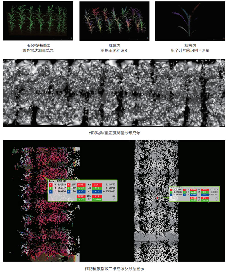 通過(guò)激光的測量,可生成植物的三維影像,用于計算群體植物的結構性狀,并且針對寬行距種植的樣品可實(shí)現群體的單株識別,對于結構簡(jiǎn)單的樣品可實(shí)現單株植物的莖葉分離,系統可精準獲取植物株高、株幅、葉長(cháng)、葉寬、葉面積、郁閉度、冠層透光率等表型參數。群體分單株:基于深度學(xué)習算法 Faster-RCNN模型,識別單株作物根部位置,利用傳統生長(cháng)法完成群體分單株,單株莖葉分割:基于區域生長(cháng)法識別和分割單株植物的莖和不同葉片,和基于深度學(xué)習識別和分割單株植物的莖和不同葉片??蓪?shí)現三維建模,按不同顏色梯度顯示高程圖。支持區域裁剪,進(jìn)行長(cháng)度、角度、面積測量。獲取掃描區域數字高程模型 DEM、數字地表模型 DSM、冠層高度模型 CHM。獲取郁閉度 CanopyCover,農作物的垂直投影占大田面積的百分比。獲取冠層透光率 Transmittance,作物不同高度層片上可接收到的入射太陽(yáng)光比例。